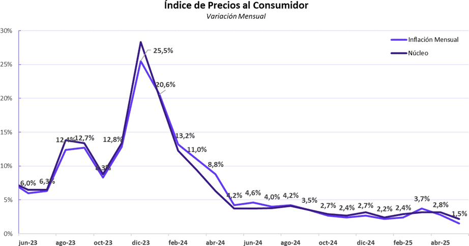 El jueves 12 por la tarde, el Instituto Nacional de Estadística y Censos (INDEC) publicó el Índice de Precios al Consumidor (IPC) correspondiente a mayo de 2025. El dato sorprendió positivamente, registrando una variación mensual de 1,5%, marcando no solo una clara desaceleración frente al 2,8% de abril, sino también el nivel más bajo desde noviembre de 2017 (sin tener en cuenta los meses de pandemia). Con este registro, la inflación acumulada en los primeros cinco meses del año asciende a 13,3%, mientras que la variación interanual se ubicó en 43,5%.