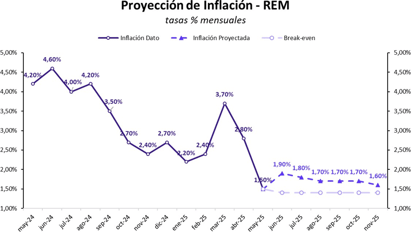 El Relevamiento de Expectativas de Mercado (REM) de mayo, difundido por el BCRA, también se alineó con expectativas que fueron ajustadas a la baja en comparación al reporte previo. La inflación esperada para mayo se ubicó en torno al 2,1% mensual, mientras que el IPC núcleo se proyectó en 2,2%. De cara a los próximos meses, el consenso anticipa una trayectoria descendente con números inferiores al 2,0%: 1,8% en junio, 1,7% en julio y 1,6% hacia noviembre. La inflación acumulada para 2025 fue corregida levemente a 27,1%, aunque se mantiene por encima de las expectativas del mercado.