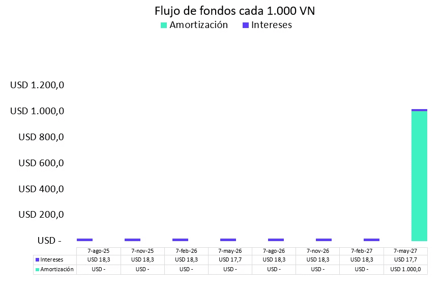 - Amortización del capital: Modalidad Bullet, con repago total al vencimiento.