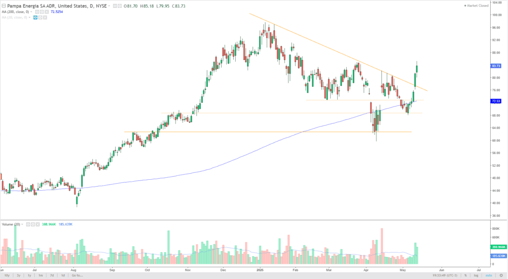 En las últimas seis ruedas bursátiles, el ADR de Pampa Energía (NYSE: PAM) ha registrado un incremento acumulado del 21,8%, pasando de US$68,93 el 5 de mayo a US$83,73 al cierre del 13 de mayo. Desde una perspectiva técnica, el papel superó recientemente una línea de tendencia bajista que venía limitando los avances desde comienzos de 2025. Esta ruptura fue acompañada por un repunte significativo en volumen, validando el quiebre alcista. Además, el ADR logró consolidarse por encima de su media móvil de 200 días (actualmente en torno a US$72,5), un umbral clave para los gestores de portafolio. Este movimiento refuerza la narrativa de reposicionamiento estratégico de la compañía y podría anticipar una etapa de revalorización si se mantiene el momentum sobre la zona de US$83-85.