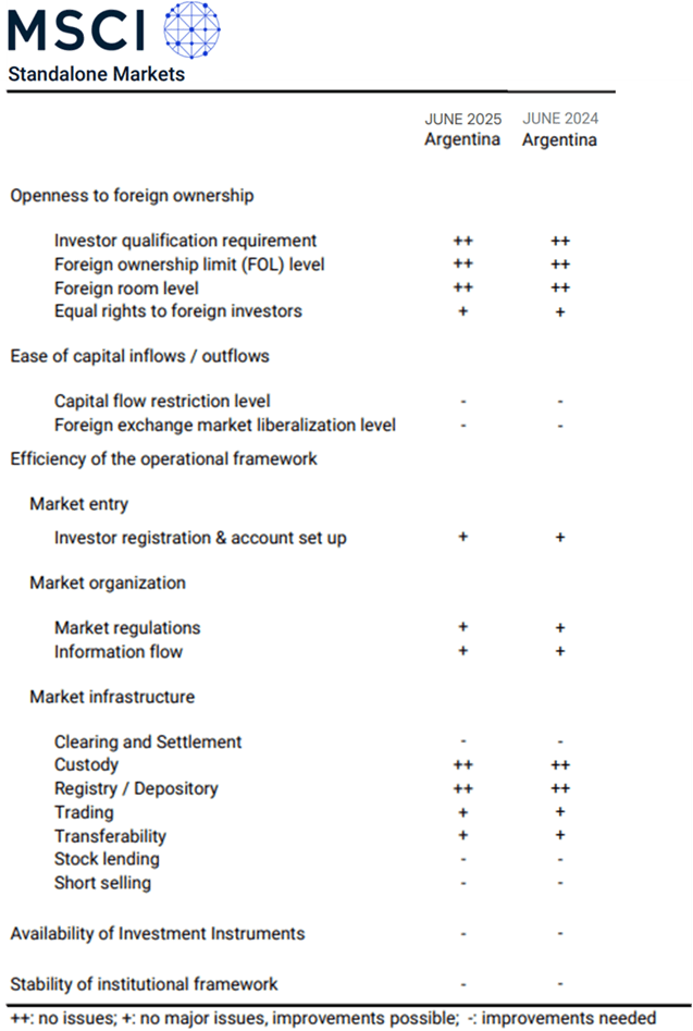 Finalmente, el día miércoles se anunciaron los resultados de la reunión anual de MSCI. En línea con nuestra expectativa (descartábamos de plano una reclasificación a mercado emergente), sin embargo, el organismo tampoco abrió una consulta para un potencial cambio de clasificación este año. Como mencionamos en el semanal anterior, más allá de los cambios realizados por la Argentina – de los que MSCI tomó nota – es muy pronto aún para esperar una reclasificación. Por lo que habrá que esperar a 2026 para novedades.