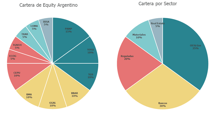 En cuanto a la cartera, decidimos hacer un rebalanceo de la misma, reduciendo nuestra exposición al sector regulado en un 5% e incrementamos nuevamente la ponderación del sector bancario a un 30% de la cartera. En cuanto al sector regulado, vemos que en el primer trimestres de 2025, los incrementos tarifarios no se encontraron por encima de los niveles de inflación mensual, mientras que los costos del gas natural y las energía aumentan debido a la estacionalidad. Por otro lado, vemos del lado del sector bancario un desplome de sus múltiplos a raíz de los resultados presentados en el primer trimestre de 2025 y exacerbados por el contexto global de los últimos meses, lo que creemos abre la puerta a una oportunidad de posicionarnos nuevamente en dicho sector. Para ello, vemos conveniente mantener un 10% en Grupo Financiero Galicia (GGAL) de manera de contar con un banco de primera línea con exposición a los diferentes segmentos (fondos comunes de inversión, seguros, retail, etc), así como también un 10% en BBVA Argentina (BBAR) dado que ha mostrado ser uno de los bancos que mejor a sabido defender su ROE en este proceso de readecuación del negocio bancario argentino, mientras que el 10% restante que asignamos al sector lo destinamos a Banco Macro (BMA), un banco que continúa mostrando una excelente posición dentro del sector y en múltiplos de valuación muy atractivos con respecto al resto. De esta forma, la cartera queda distribuida de la siguiente manera:
