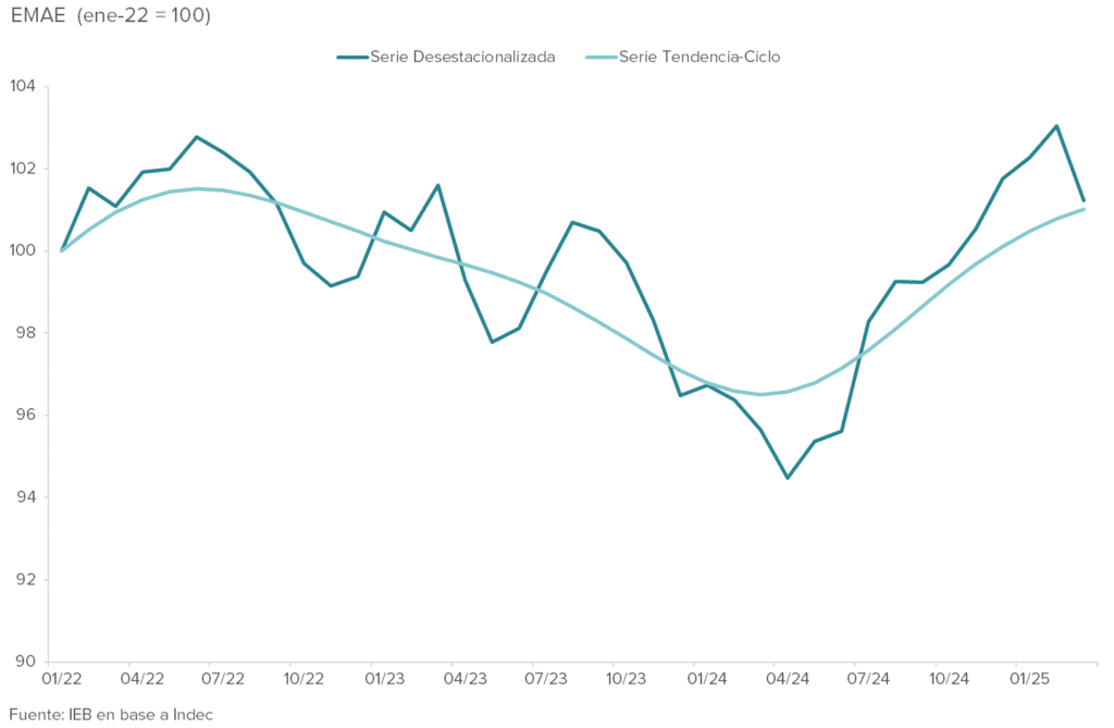 Cambiando de tema, como comentamos en la página anterior, el INDEC dio a conocer el EAME de marzo. El estimador mensual de actividad económica se incrementó 5,6% respecto al mismo mes de 2024, mientras que el indicador desestacionalizado descendió 1,8% en forma mensual, cayendo por primera vez desde abril del año pasado.