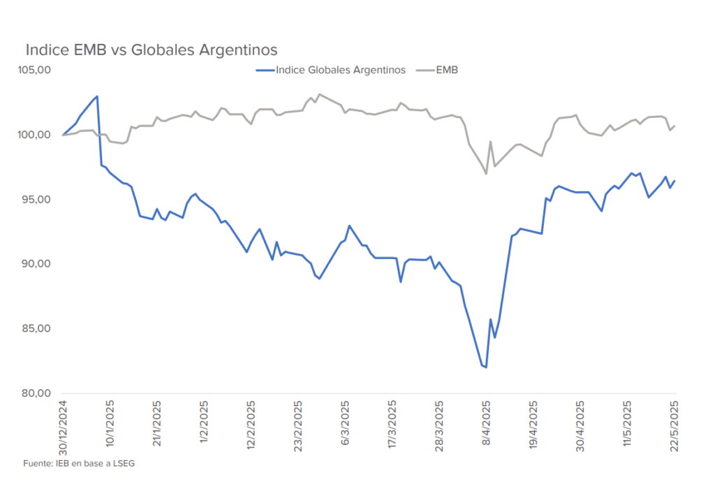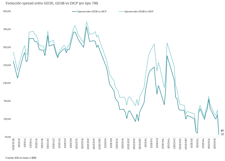 Cabe destacar que la deuda soberana está comprimiendo, ante un contexto internacional adverso, donde los rendimientos de los países desarrollados como Japón y EE.UU. se encuentran presionados. A la rebaja de la calificación crediticia de los bonos del tesoro americano se sumó la aprobación del proyecto de ley fiscal de Trump en la cámara de representantes, que evitaría un aumento de impuestos y presionaría sobre la carga de deuda estadounidense, alimentando aún más las preocupaciones del mercado sobre la sostenibilidad del déficit fiscal americano.