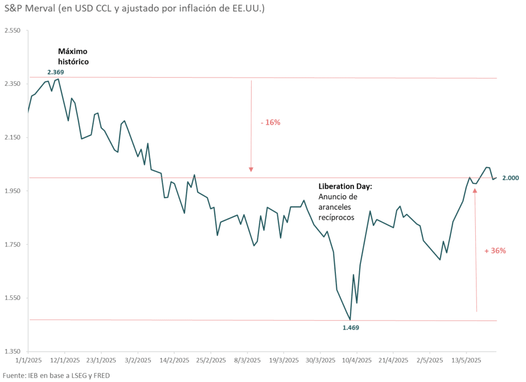 El equity argentino no quedó ajeno a dicha dinámica y quebró su racha alcista luego del triunfo del oficialismo en las elecciones porteñas. Cerrando en 2.000 puntos el índice queda 36% por encima del mínimo tocado a principios de abril de este año pero aún un 16% por debajo del máximo de 2.369 puntos registrado a principios de este año.