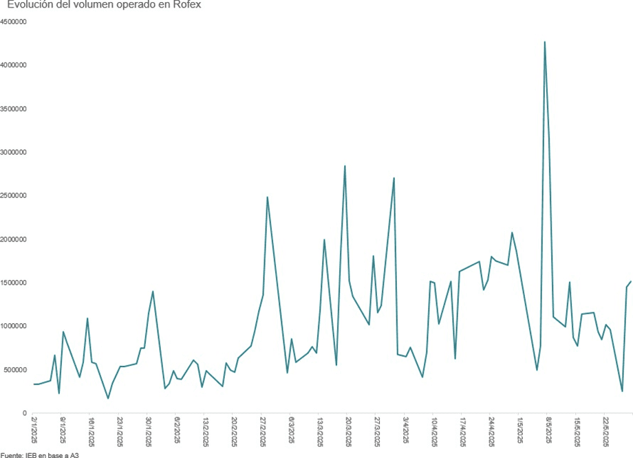 Con respecto a las expectativas de inflación los bonos tienen en precio para el año 2025 una inflación del 26% y del 14,25% para el 2026, mientras que el REM proyecta una inflación de 31,8% para 2025. Parados en el corto plazo el efecto es el inverso: vemos que los datos de alta frecuencia proyectan una inflación de 2,17%, mientras que el “break even” se ubica en 1,55% promedio mensual hasta agosto. Con respecto a la licitación debemos destacar que el tesoro realizó un “roleo” del 126,3%. Esto es considerando solamente los AR$6,8 BB que vencían esta semana. Teniendo en cuenta los pagos de cupones y amortizaciones que vencieron la semana pasada por un total de AR$1,8 BB la suma totaliza AR$8,6 BB lo que lleva el “roleo” a un 100% de lo vencido. Por otra parte, consideramos que es importante destacar que estimamos una inyección de liquidez por AR$1,4 BB, producto de la emisión del Bonte, destinado a engrosar las reservas del BCRA.
