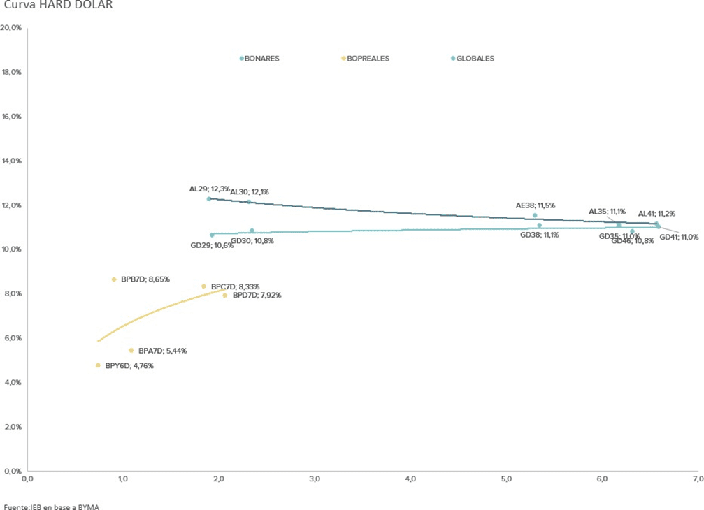 Los bonos HD corrigen un 0,33% WTD y 1,60% MTD a lo largo de toda la curva, operando con TIRs entre 10% y 11%, como veremos en el gráfico a continuación todavía la curva para los Bonares sigue invertida, pero para los globales ya va teniendo una leve pendiente positiva.