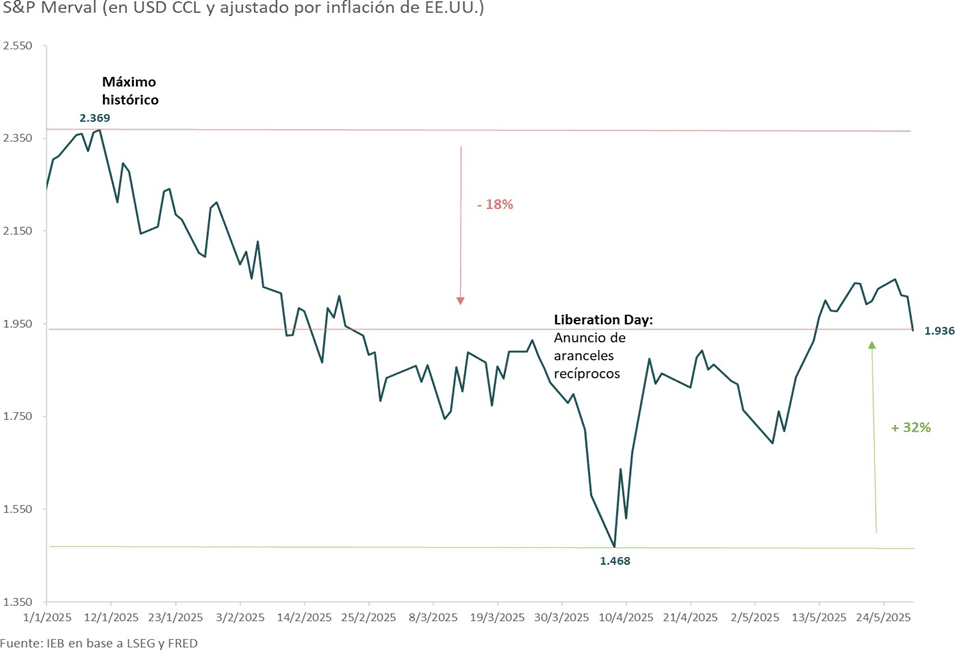 ● Los resultados del 1T25 de los bancos argentinos propiciaron una corrección del índice de acciones argentinas, dejando una caída del 18% en dólares desde el máximo alcanzado a principios del 2025. No obstante, aún muestra una fuerte recuperación luego de caer hasta los USD 1.468.