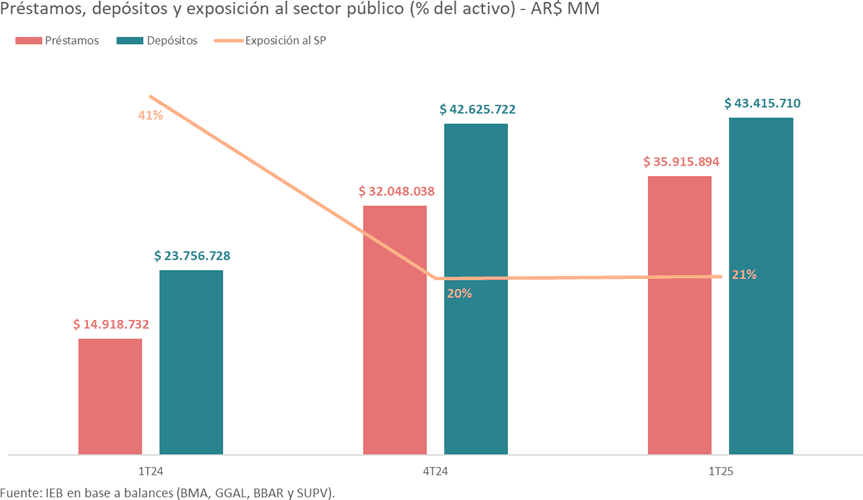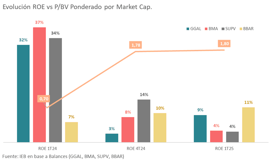 Es evidente, observando el gráfico inferior que los ROEs que reportaban los bancos hasta el 2T24 evidenciaban un negocio que nada tenía que ver con el de un banco. Los bancos argentinos se comportaban como agencias de financiamiento del sector público; ROEs elevados, riesgos elevados (default, reperfilamientos, etc.) por tanto el mercado no convalidaba valuación mayores a P/BV de 1x. Sabíamos que el “trade-off” de transición entre una banca-agencia que proveía financiamiento al sector bancario a una banca tradicional de negocio de intermediación financiera iba a llevar tiempo y sacrificar temporariamente ROEs. Durante todo el año pasado sostuvimos que el gran desafío para el sector era justamente ese: la velocidad con la cual podría apuntalar la caída de los ROEs el desarrollo del negocio tradicional.