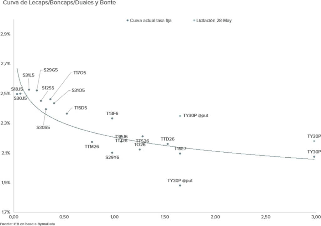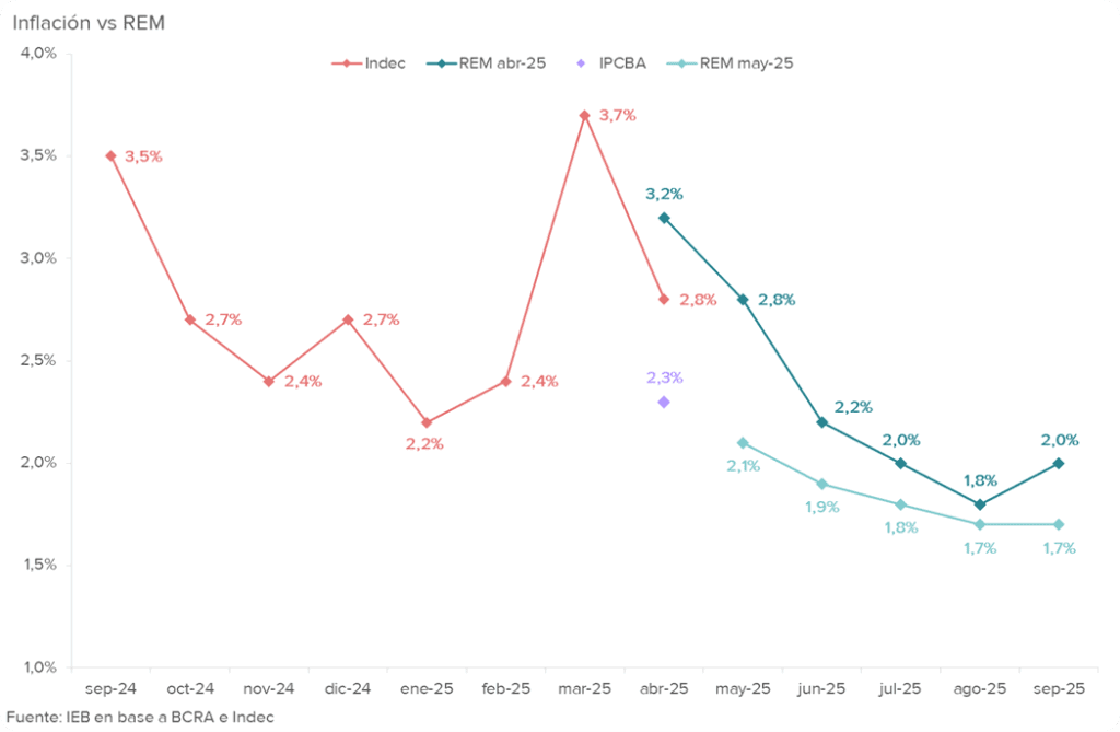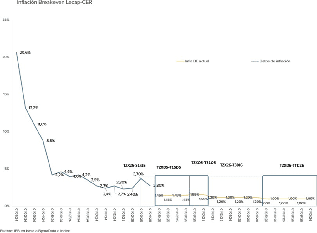 Por otra parte, al cierre de ayer se conoció el REM de mayo que proyecta una inflación de 28,6% para 2025 y 2% específicamente para mayo. Hay consultoras incluso que en los últimos relevamientos muestran datos para mayo por debajo de 2%. La inflación “break even” que pricean los bonos promedio mensual en el periodo Mayo-Agosto es de 1,45% aún más optimistas que los datos del relevamiento de la autoridad monetaria.