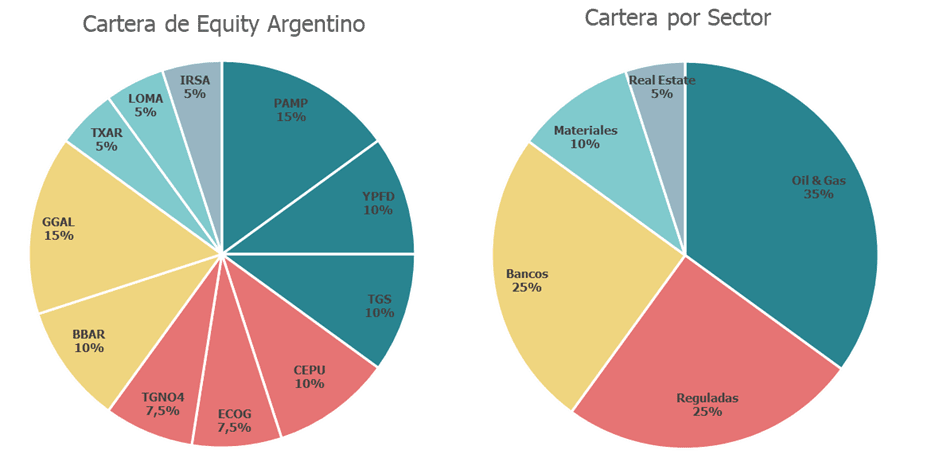 - La cartera mantiene los cambios realizados la semana previa. Con una menor exposición al sector bancario, reemplazado por la incorporación del sector de Real Estate y una mayor ponderación para el sector Regulado a través de Ecogas Inversora (ECOG), Transportadora de Gas del Norte (TGNO4) y Central Puerto (CEPU).