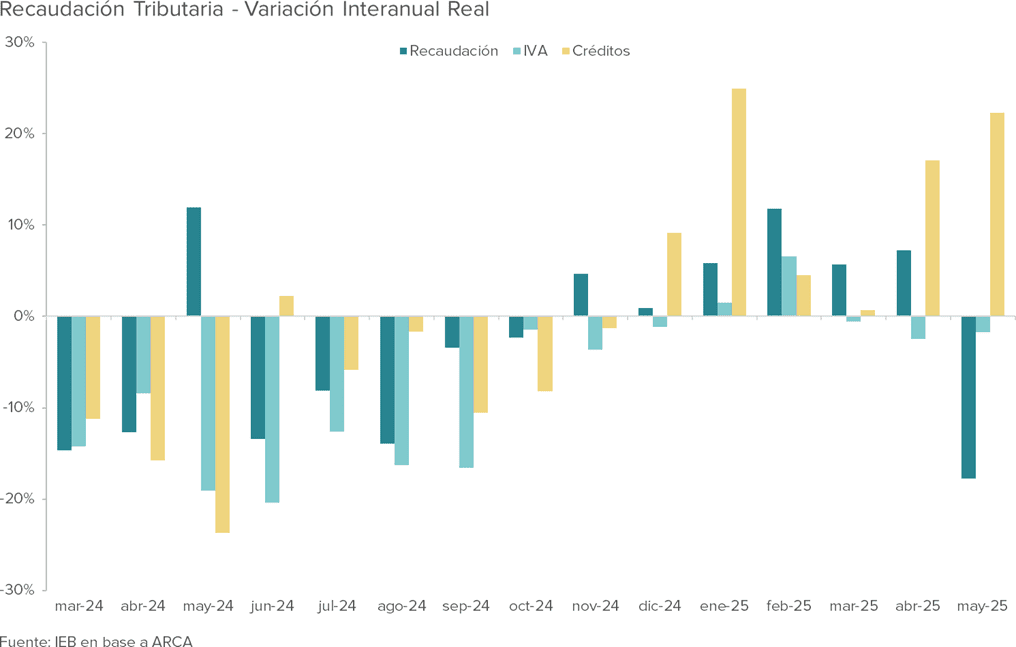 - La recaudación correspondiente a mayo, registró una caída interanual real del 17,8%, asumiendo una inflación de mayo del 2%. Esta fuerte contracción se explicó, en gran medida, por el desempeño del impuesto a las Ganancias, que mostró una baja real del 40% interanual. Cabe recordar que en mayo del año pasado este tributo había registrado un crecimiento real del 82%, impulsado por el impacto de la devaluación de diciembre de 2023 sobre las declaraciones juradas de personas jurídicas.