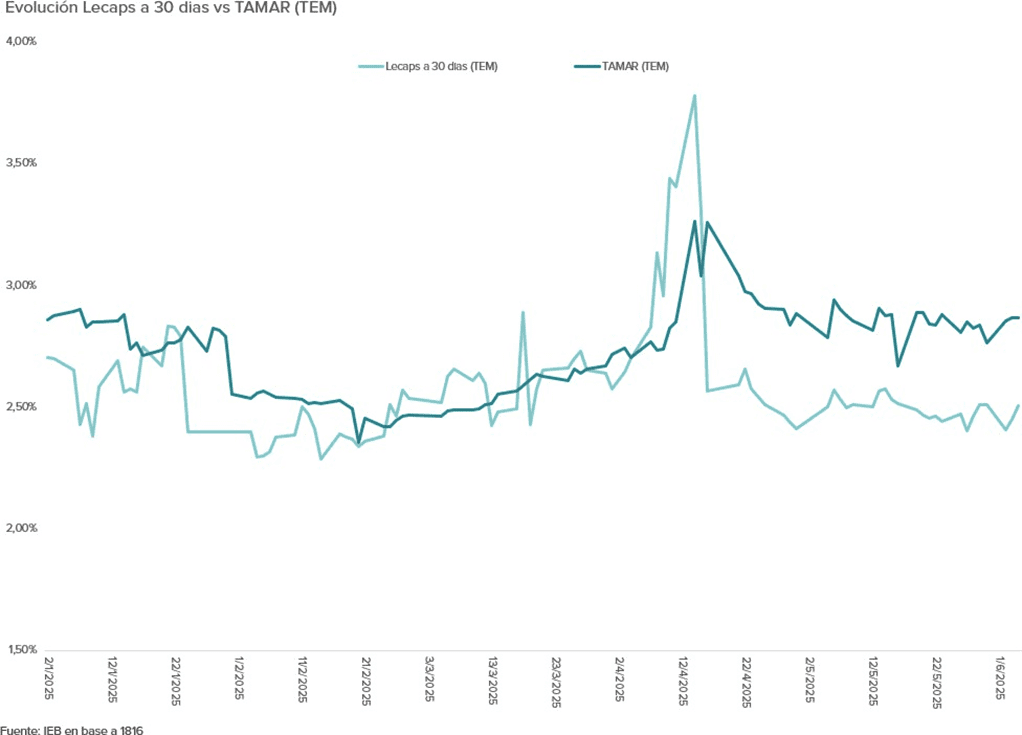 Nos resulta interesante mostrar el spread de tasas que persiste entre la Lecap a 30 días y la tasa de Tamar. Este diferencial se viene observando desde mediados de abril y persiste hasta la actualidad, dada la capacidad de los bancos de seguir otorgando préstamos con tasas activas muy superiores a la TAMAR.