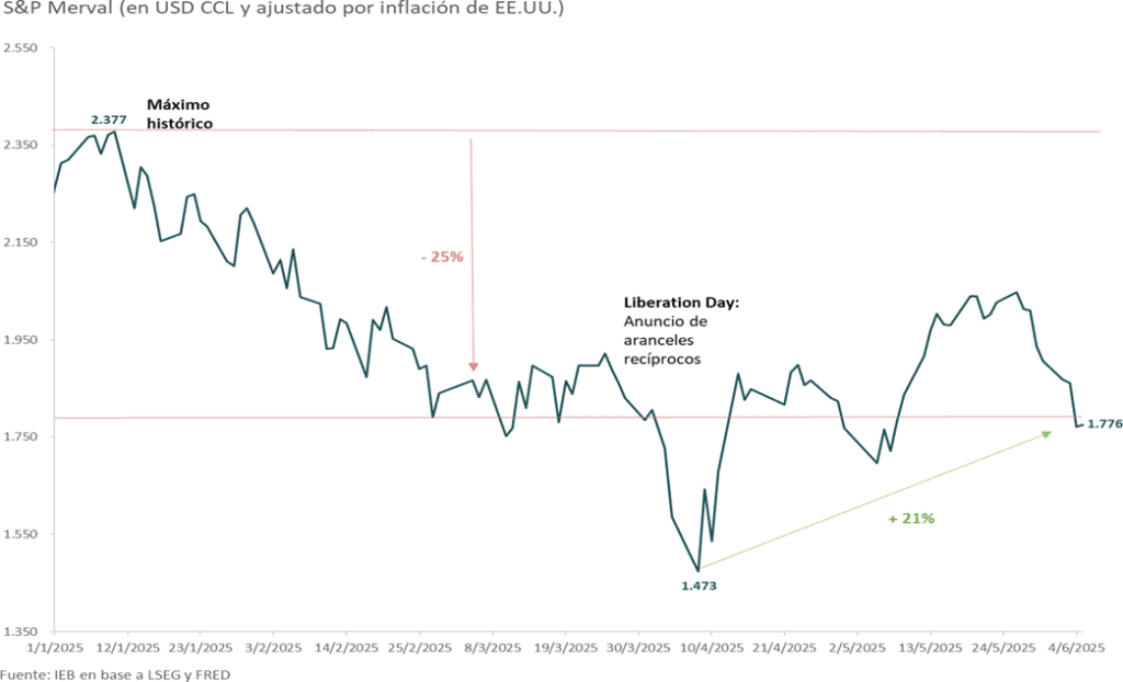 La renta variable local continuó con una tendencia a contramano del contexto internacional, acentuando su caída hasta los USD 1.776 luego de recuperar un 21% desde el mínimo de USD 1.473 tras el “Liberation Day” que dio inicio a elevados niveles de volatilidad en la renta variable global. Creemos que gran parte de la contracción en el índice de acciones local se debió al arrastre producido por la caída del sector bancario tras presentar resultados por debajo de los esperado para el 1T25 y a un mercado que nuevamente se encuentra a la expectativa de “drivers”.