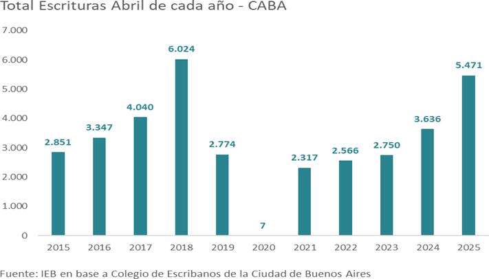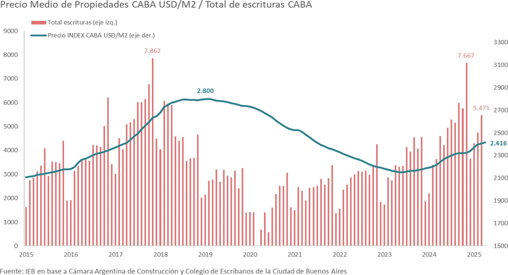 Si bien se puede notar un comportamiento estacional a lo largo de los años en cuanto al total de escrituras en CABA – iniciando el año con su mínimo y una tendencia positiva que culmina en su máximo en diciembre – podemos observar un aumento en la actividad en comparación a los mismos periodos de años anteriores, al mismo tiempo que un recupero del precio medio de las propiedades en CABA ante el incremento en el precio del m2. Así mismo, si comparamos cada abril de los últimos 10 años, podemos notar una mejora para la comercialización de inmuebles en 2025 tras una recuperación en las escrituras, situación que estará favoreciendo al segmento de compra-venta de inmuebles de IRSA de cara a los resultados del 2T25.